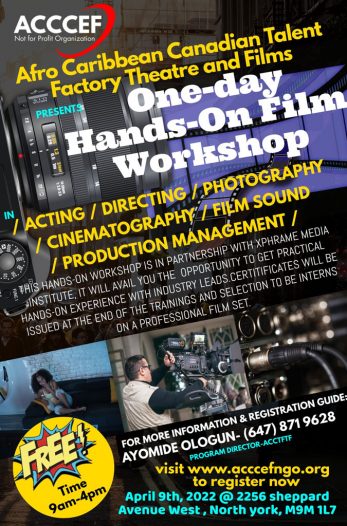 Recent Acting for Film, TV & the Theatre graduate Ayomide Ologun-Kolawole will be tackling a brand new role during an upcoming series of workshops hosted by the Afro Caribbean Canadian Cultural and Entertainment Foundation (ACCCEF) – that of a teacher.